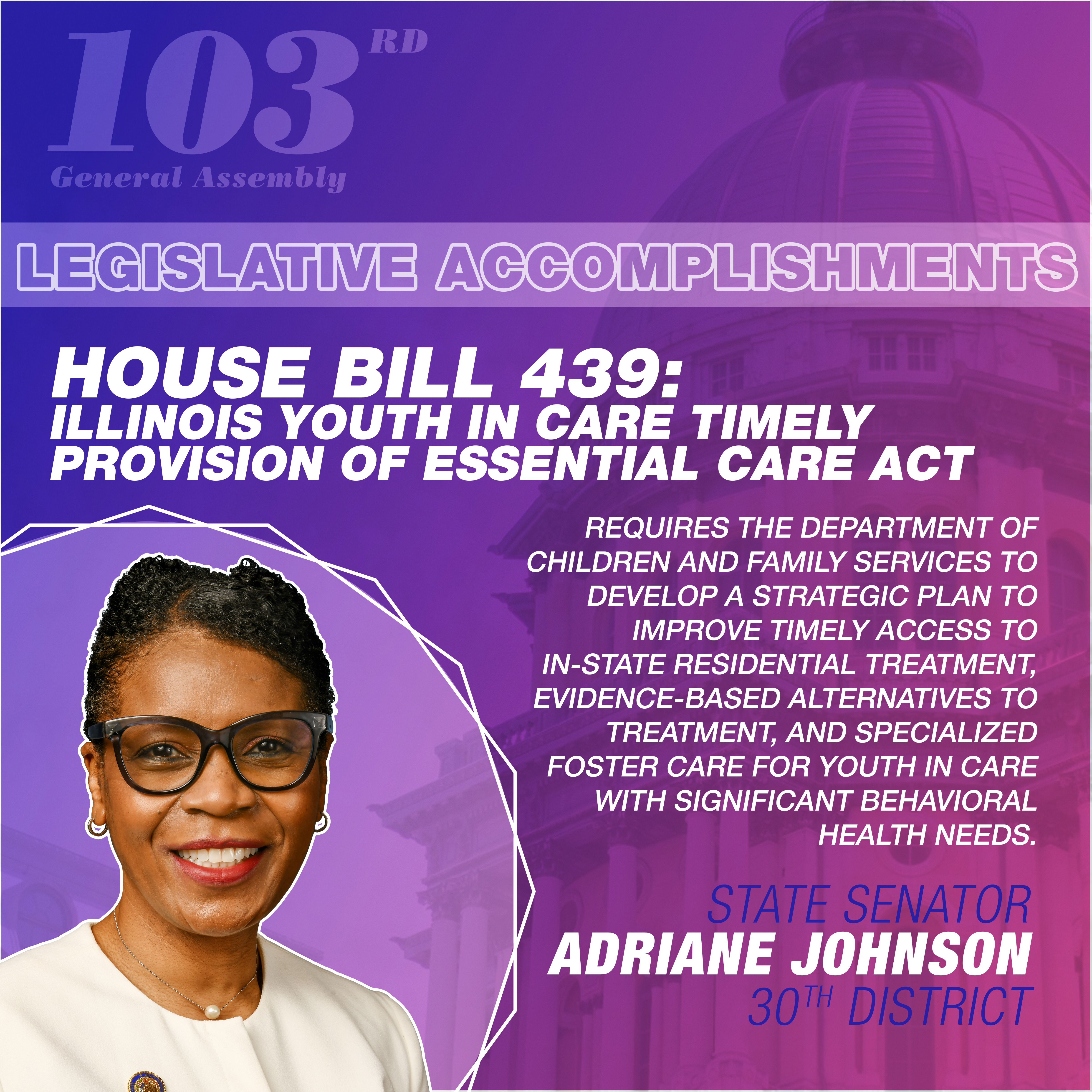SPRINGFIELD – State Senator Adriane Johnson’s law to ensure children with behavioral and mental health needs in DCFS’s care get timely access to essential treatment went into effect Monday, Jan. 1.